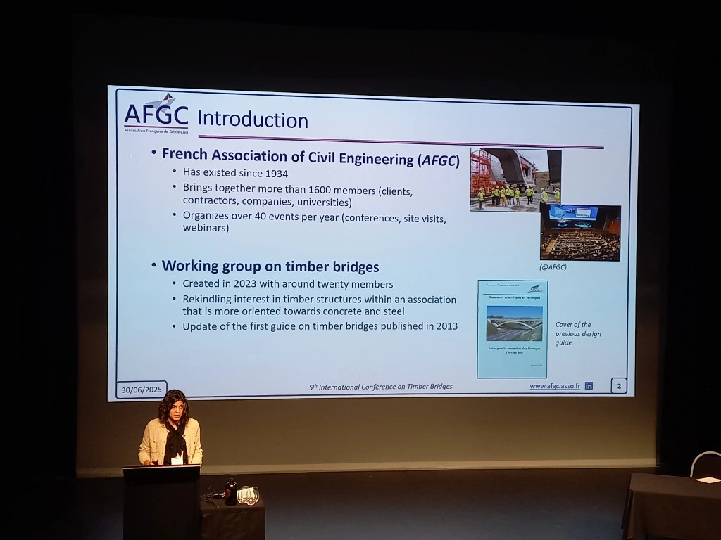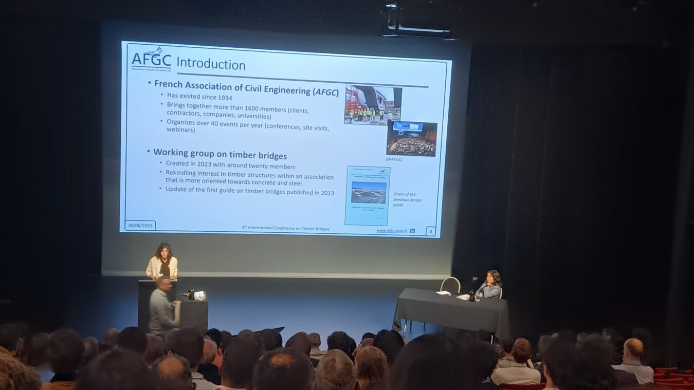 Dans le cadre du groupe de travail sur les ouvrages en bois, Valentina Bruno-Hure (Setec) a présenté l’avancée des travaux du groupe lors de la 5ème conférence internationale sur les ponts en bois (ICTB 2025).