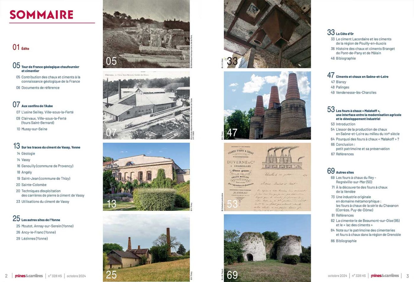 en lien avec cette journée, ci dessous le sommaire du bulletin n°328 de Mines et Carrières, consacré au patrimoine industriel cimentier et chaufournier