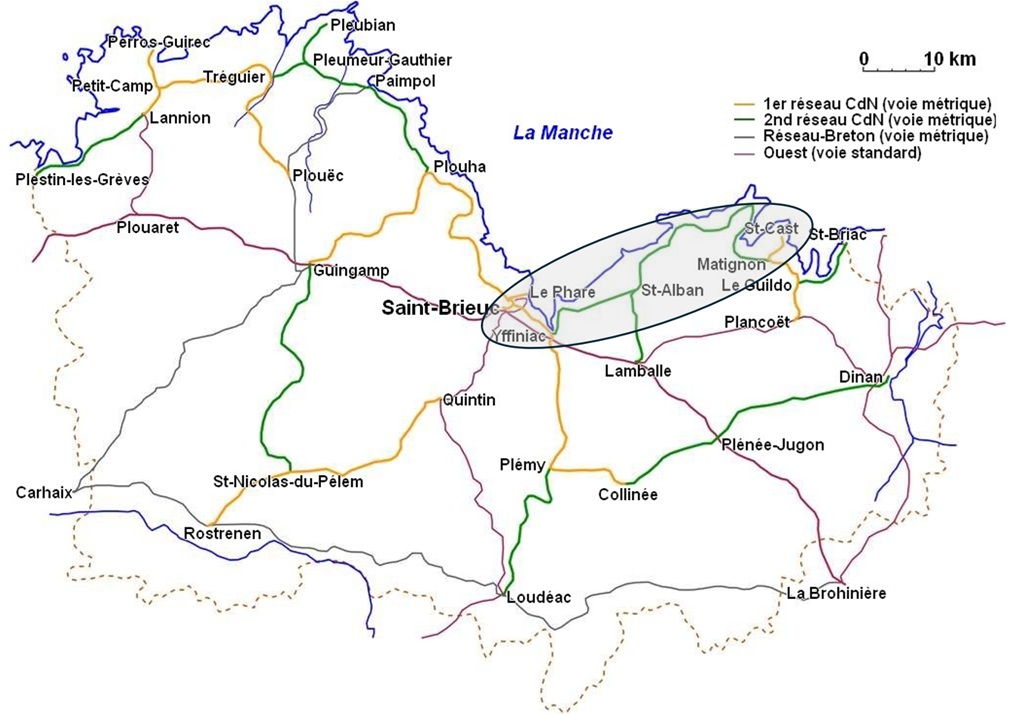 Cette ligne, d’une cinquantaine de kilomètres longe la côte et passe notamment par Hillion, les Ponts Neufs, le Val André, Pléneuf, Erquy, Sables-d’Or-les-Pins, Plévenon et Préboulle. Outre le viaduc de Caroual, de nombreux ouvrages d’arts sont construits par l’ingénieur Harel de la Noë sur cette ligne, comme par exemple le viaduc des Ponts-Neufs, le viaduc de Port-Nieux, la passerelle de la côtière, le pont des marais.