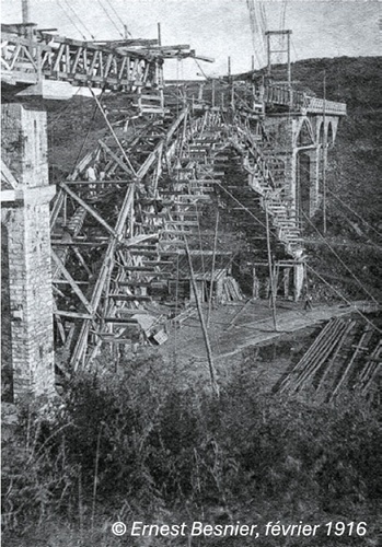 Les travaux débutent fin août 1913 par la mise en œuvre des piles et des arches en maçonnerie. Les huit demi-arcs de six mètres sont coulés au début de l’année 1914. Côté Matignon, les deux arches en maçonnerie sont achevées en juin 1914 et les quatre demi-arcs préfabriqués sont en place. A cette même période, côté Yffiniac, l’arche maçonnée est achevée et l’arche de 12 m est en cours de réalisation. En novembre 1914 les travaux des arches latérales sont en voie d’achèvement ; la guerre, déclarée le premier août entraine une réduction de personnel. Fin juillet 1915, les travaux des cinq arches latérales sont pratiquement terminés. Début février 1916, le cintre en bois servant de coffrage à l’arc centrale est en place. L’ouvrage est achevé durant l’été 1916 et les essais par poids mort sur la travée centrale sont réalisés du 13 au 18 novembre 1916.